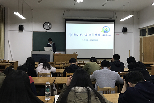 4月19日,生物科学1501团支部在13号教学楼215教室举行“学习吕书记回信精神,争做五有人才排头兵”系列活动。活动分“学习吕书记回信精神”主题团日活动、“学习优秀员工王志良”系列活动及参观校史馆三部分进行。此次活动由团支书吕科梁和班长刘洪洋共同主持,团支部全体同学参加。