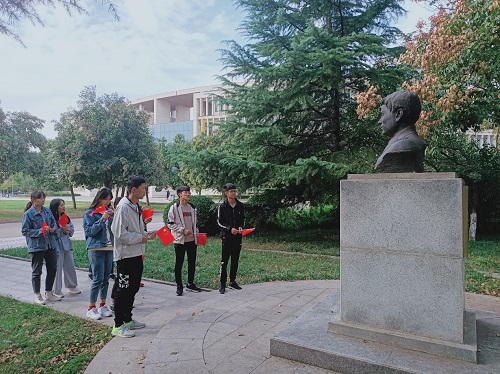 最后,孟荣带领同学们前往图书馆南侧瞻仰冯思广雕像。同学们手捧五星红旗,以最真挚的感情表达对人民英雄的敬意。在缅怀英雄冯思广的同时,学习冯思广精神,树立远大目标,争做五有报国人。