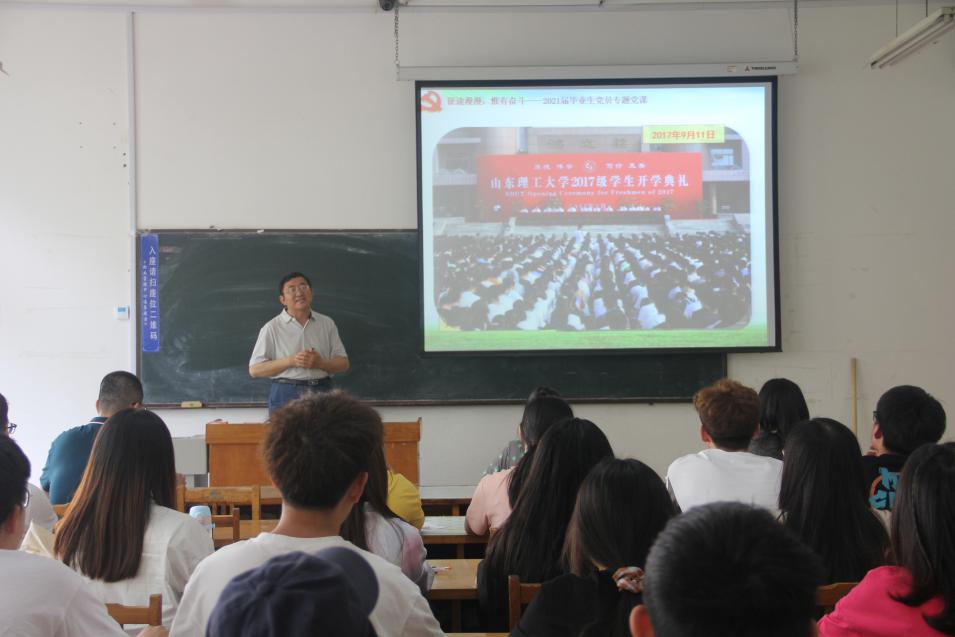 郭万保为2021全体毕业生党员讲授题为《征途漫漫,惟有奋斗》的专题党课。通过回顾四年前开学典礼等标志性事件,对毕业生通过四年努力顺利完成学业表示祝贺并代表学院向2021届全体学生对学院建设发展所作出的积极贡献表示感谢