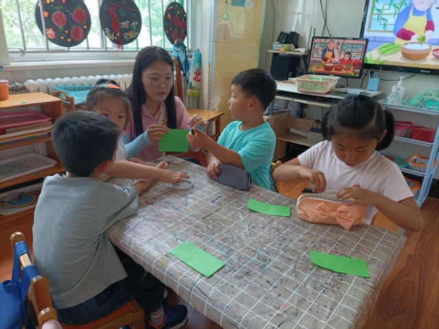 活动开始前,党员们平均分为两组,分别到两个教室与小朋友们一起包粽子。家围绕在桌前,纷纷露出看家本领,捋粽叶、做漏斗状、填糯米、压紧实、封口、扎捆,巧手翻飞,不一会儿功夫,三角形、长条形等一只只各式各样的漂亮粽子瞬间成型,两个多小时内共包好了近1000个粽子。在包粽子过程中,小朋友们拿着粽叶一步一步跟着学习,党员们帮助小朋友将粽子封口、捆扎,共同努力下,小朋友们包出了一个自己的粽子,并欣喜的拿个老师。随后,党员们带领幼儿园小朋友一起做手工,用卡纸折粽子,小朋友们还用彩笔为折出的粽子做装饰,在党员的帮助下,有的在上面画上一双水灵灵的眼睛,有的在上面写上祝福的话语。整个过程中,处处洋溢着节日的气氛和欢乐的笑容。