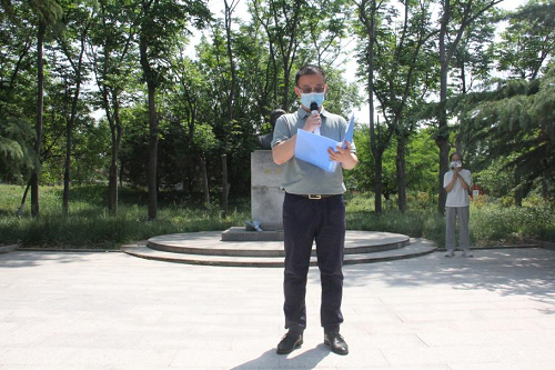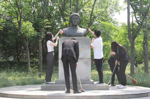 学生代表擦拭冯思广雕像,清扫冯思广雕像周边杂物,并敬献鲜花,以表缅怀之情。